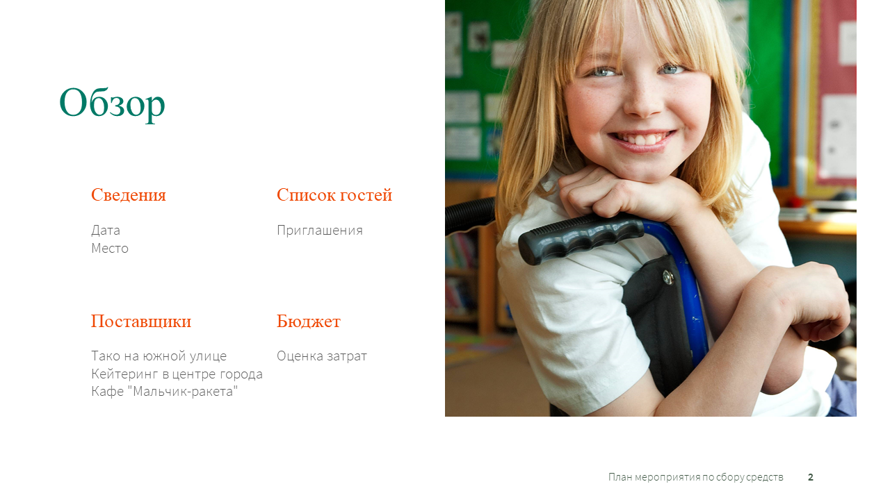 Спланируйте мероприятие по сбору средств для своего учебного заведения или другой организации с помощью этого шаблона PowerPoint со специальными возможностями. Этот шаблон помогает отслеживать задачи и содержит обзор, который включает дату, время, место, список гостей, поставщиков и бюджет. Поддерживайте порядок путем отслеживания ответов, сведений о поставщиках продуктов и напитков, а также параметров бюджета.